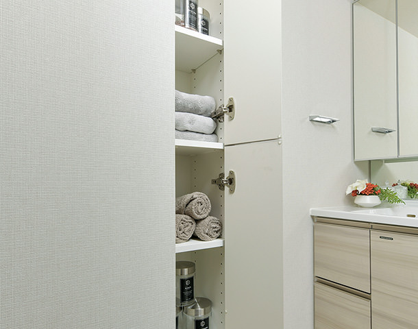 タオル類などの整理・収納に便利なリネン庫を、洗面室に設けています。