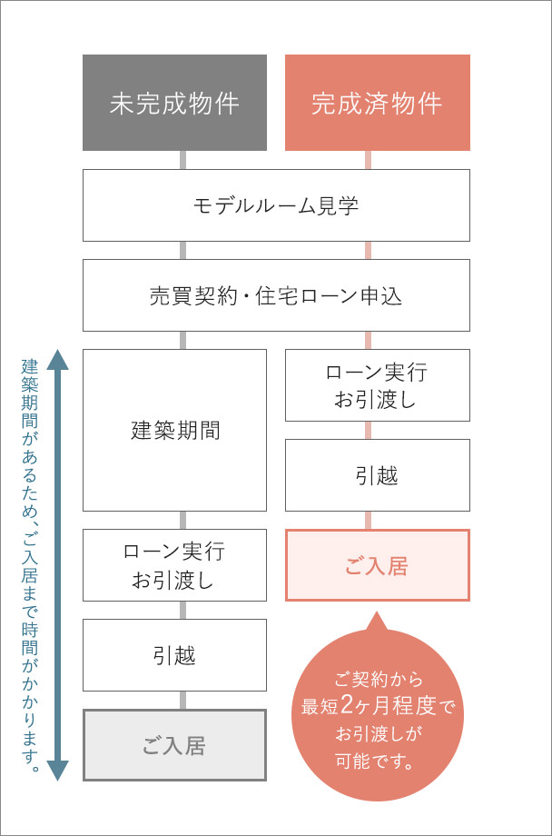 完成済マンションは諸手続きの完了後、即入居が可能です。完成を待たなければいけないマンションとは異なり、住宅ローンの返済を早く始めることができます。今の住まいが賃貸であれば、入居までに支払う家賃も最小限に。また、4月の新入学・新学年シーズンまでに引っ越しを完了できるため、お子様のいらっしゃるご家庭には特に望ましいタイミングを選べると言えます。